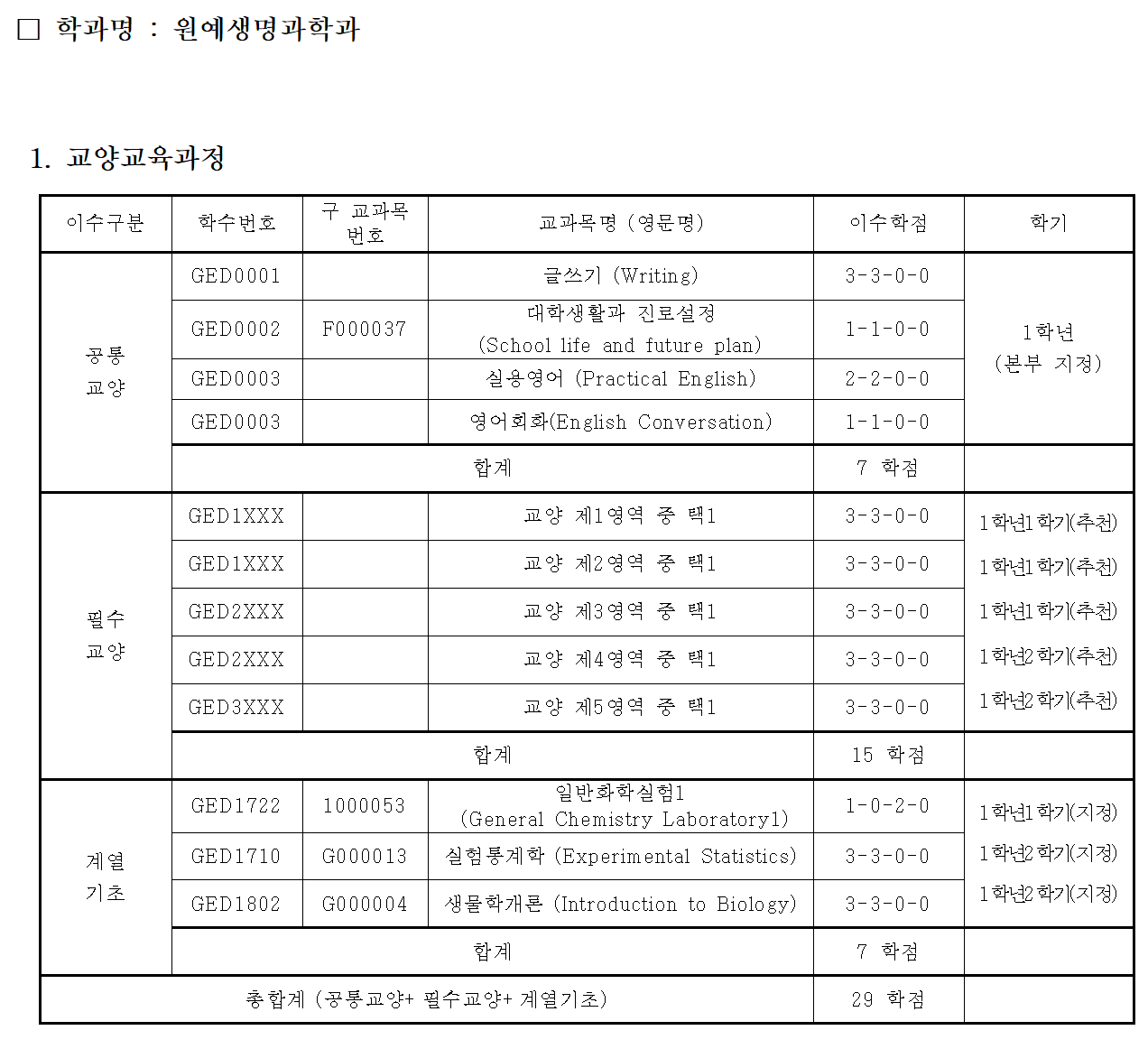 기존 계열기초 교과목이던 실험통계학, 일반화학실험1, 생물학개론이 자연과학의 이해, 일반화학실험1, 생명과학으로 변경되었습니다.