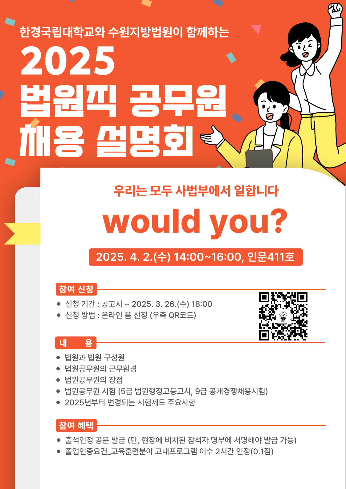 [취업처_비교과 프로그램] 2025년 법원공무원 채용시험 설명회 참여 신청 안내(~3. 25.(수) 18시까지 신청)