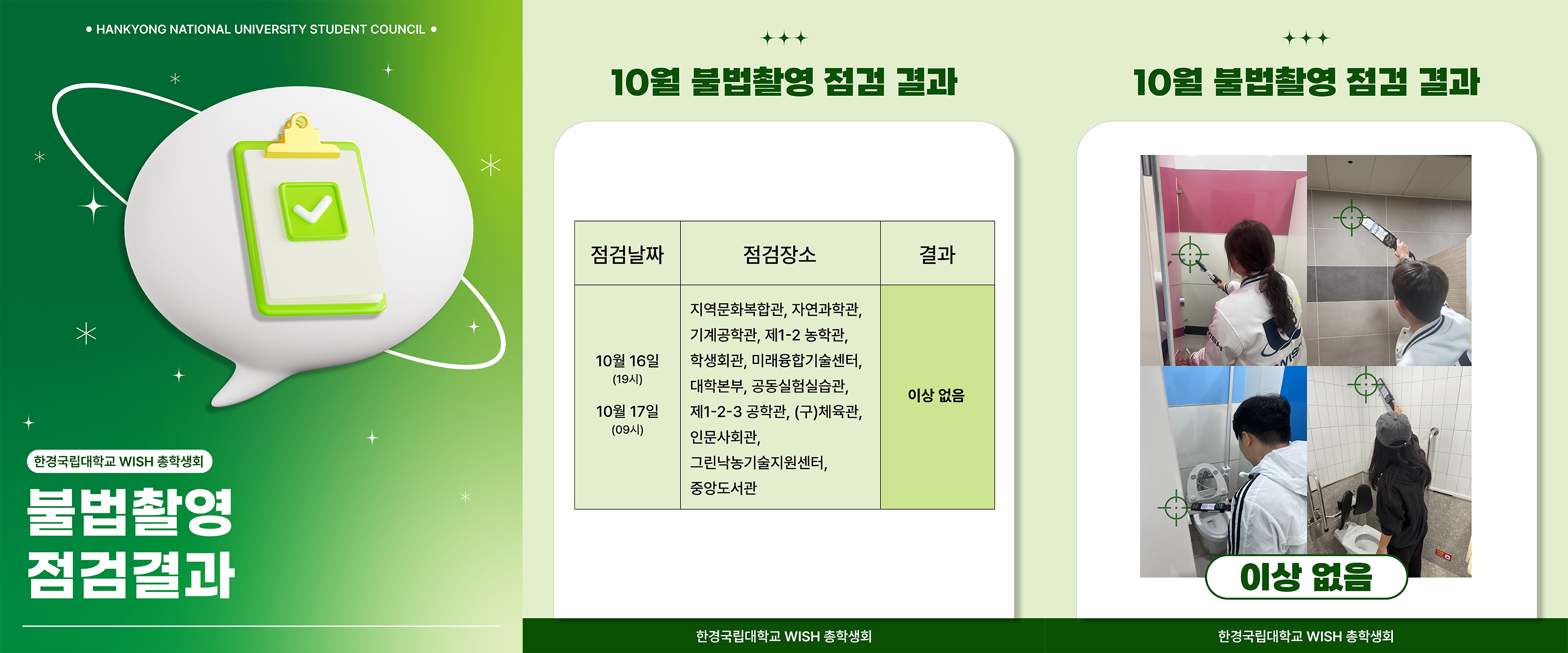 저희 WISH 총학생회에서는 불법 촬영에 대한 우려를 해소하고 안전한 공간을 만들기 위해 점검을 실시하였습니다.