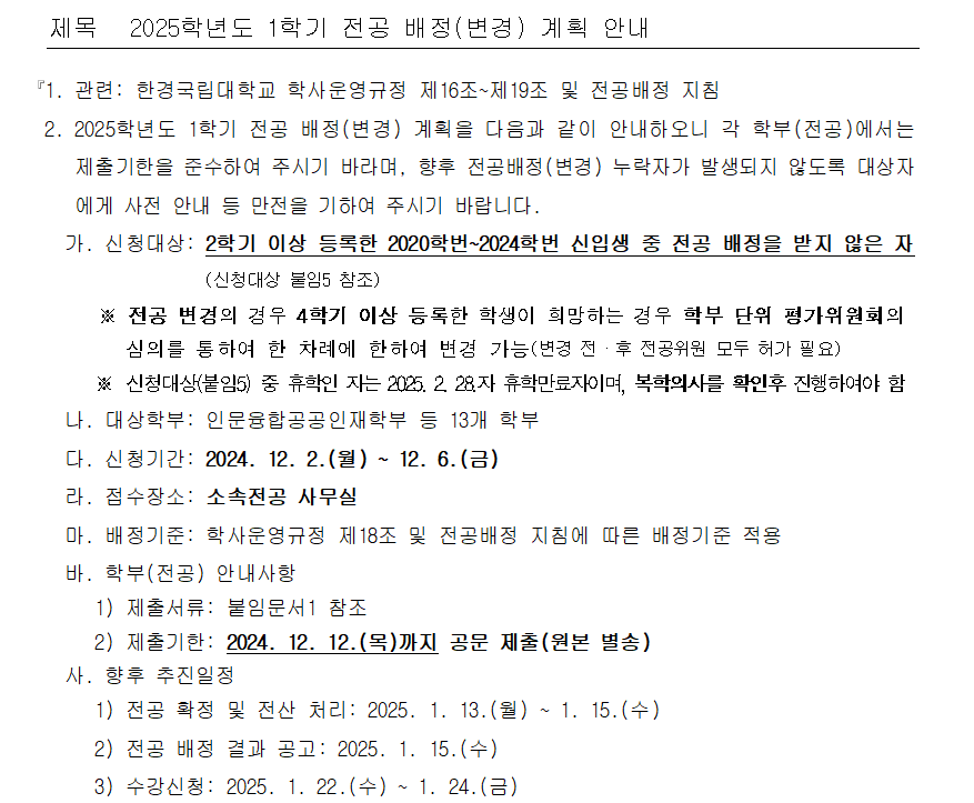 2025학년도 1학기 전공 배정(변경) 계획 안내