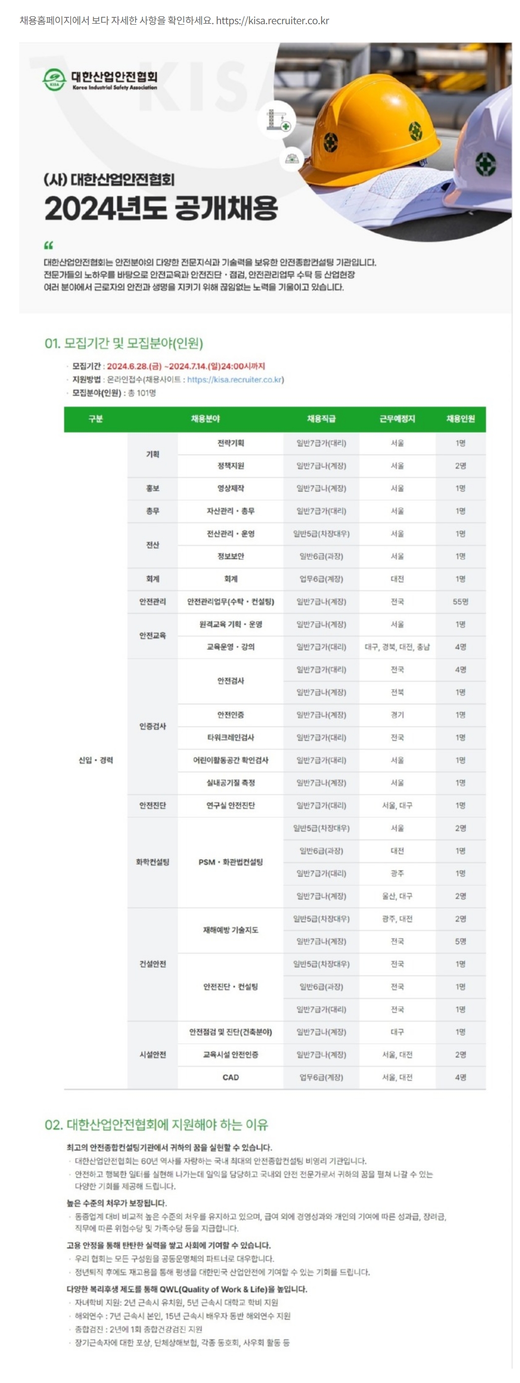 * 채용공고 해당링크(오른쪽 파란글씨 클릭 =>): 대한산업안전협회 | 공개채용 (safety.or.kr)