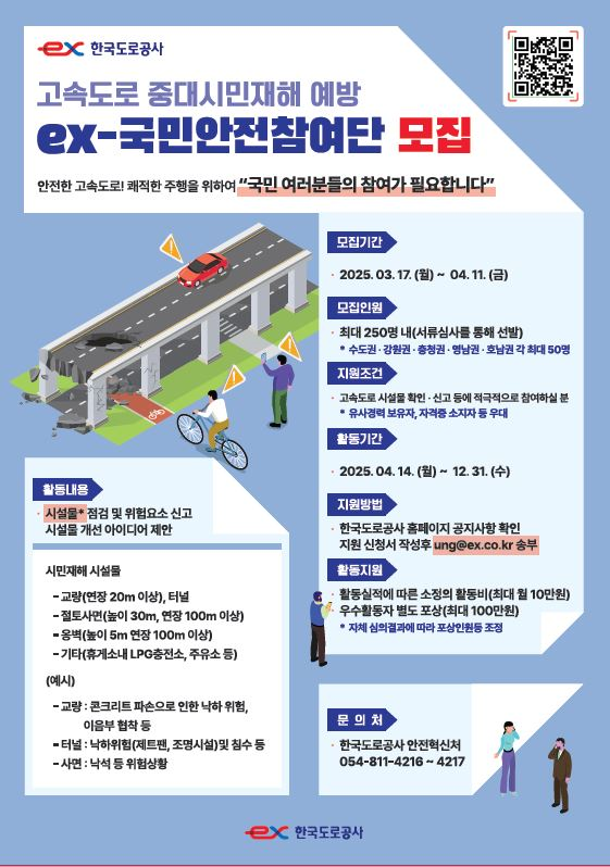 □ 한국도로공사(사장 함진규)는 3월 17일(월)부터 4월 11일(금)까지 중대시민재해* 예방을 위한 국민참여형 안전활동 ‘ex-국민안전참여단’을 모집한다고 밝혔다.