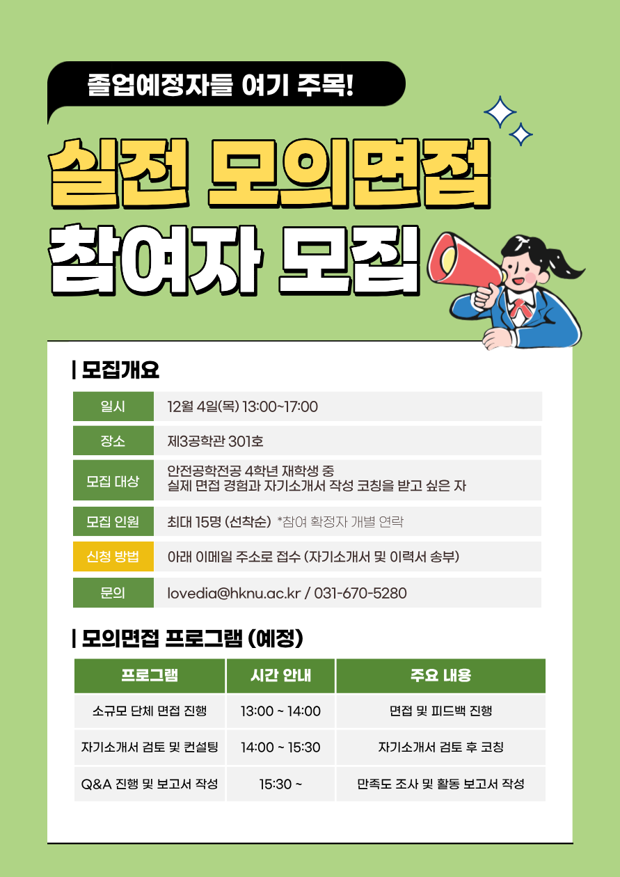 안전공학전공에서 실전 모의면접과 자기소개서 컨설팅을 함께 받아볼 수 있는 프로그램을 개최합니다.