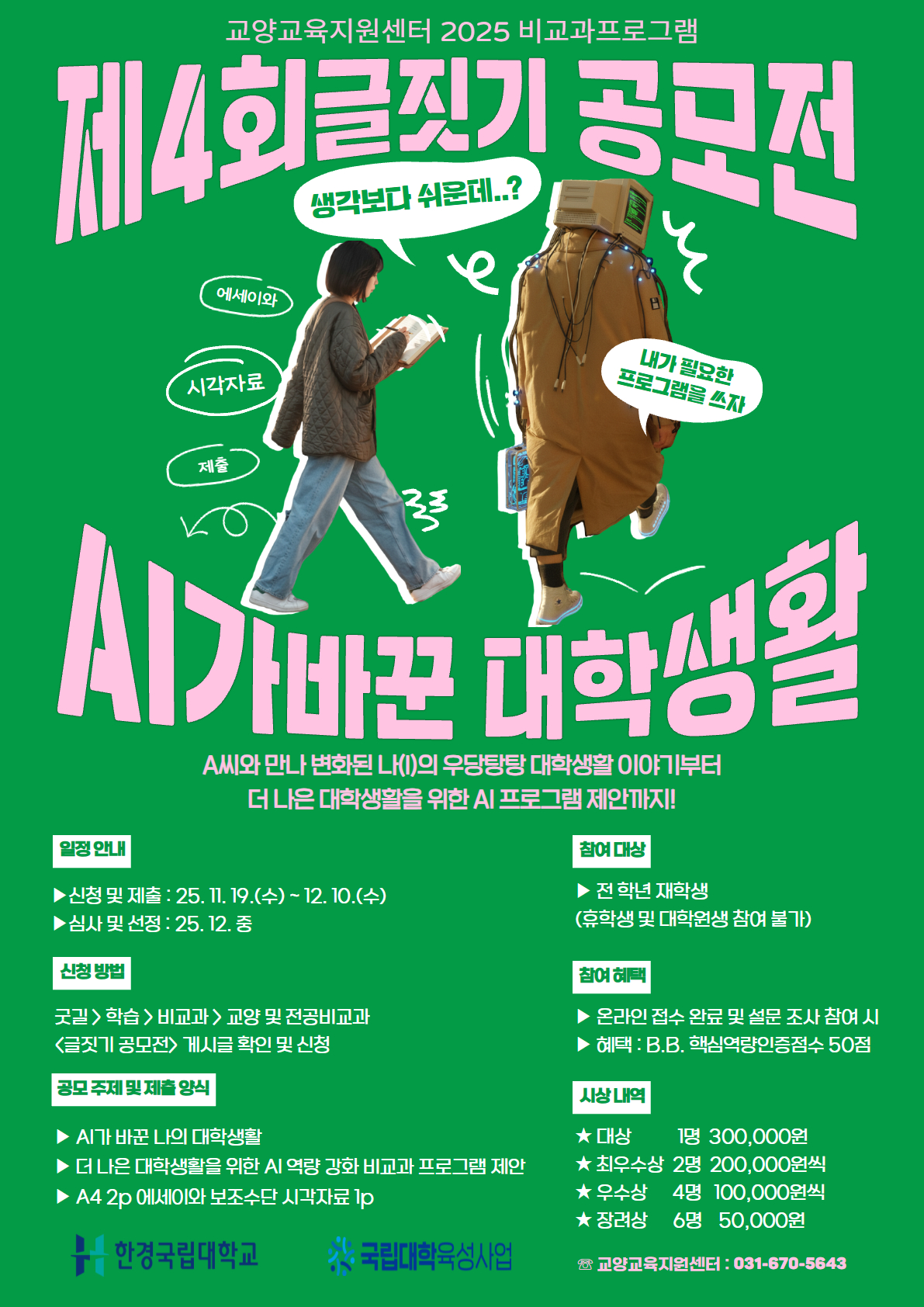 교육혁신본부 교양교육지원센터에서 제4회 한경 글짓기 공모전 기간을 연장합니다. 재학생 여러분의 많은 참여 부탁드립니다.
