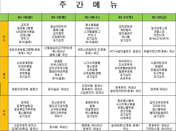 2024. 3. 18. ~ 2024. 3. 22. 주간식단표