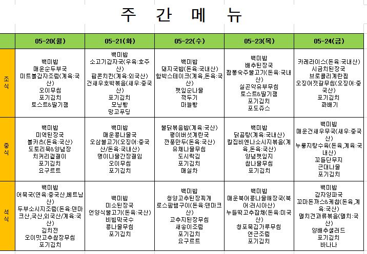 2024. 5. 20. ~ 2024. 5. 24. 주간식단표