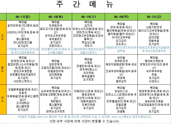 2024. 6. 17. ~ 2024. 6. 21. 주간식단표