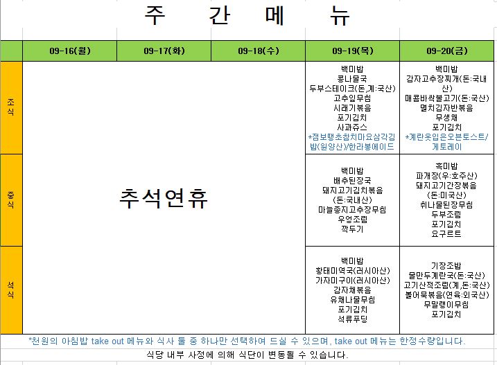2025. 9. 15. ~ 2025. 9. 19. 주간식단표