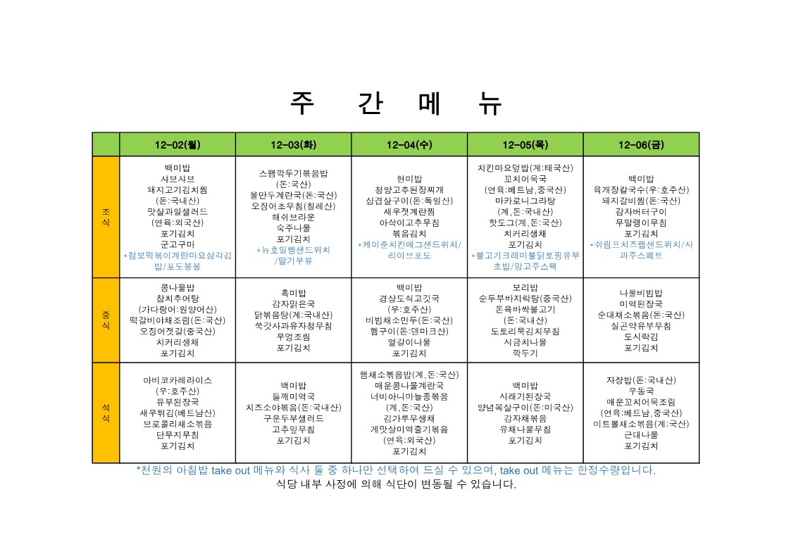 2025. 12. 1. ~ 2025. 12. 5. 주간식단표