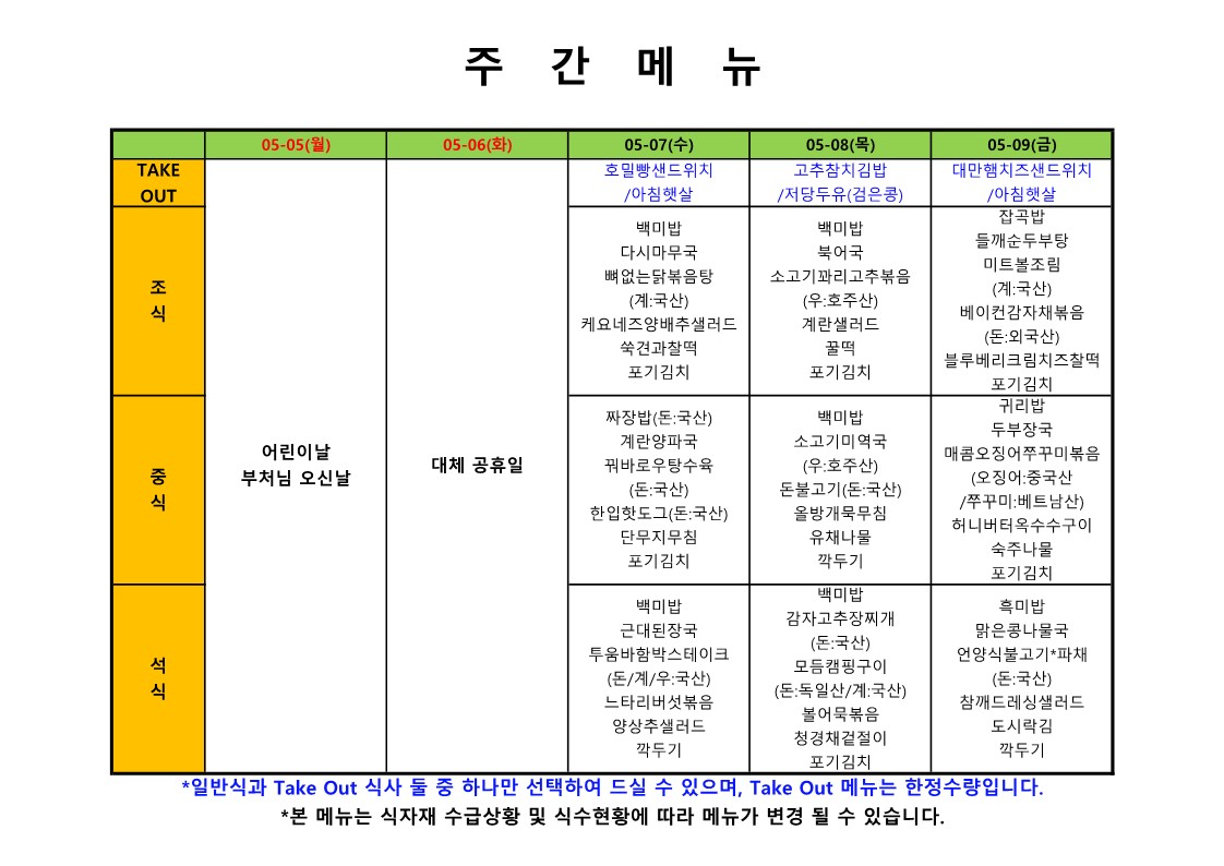 2024. 5. 13. ~ 2024. 5. 17. 주간식단표