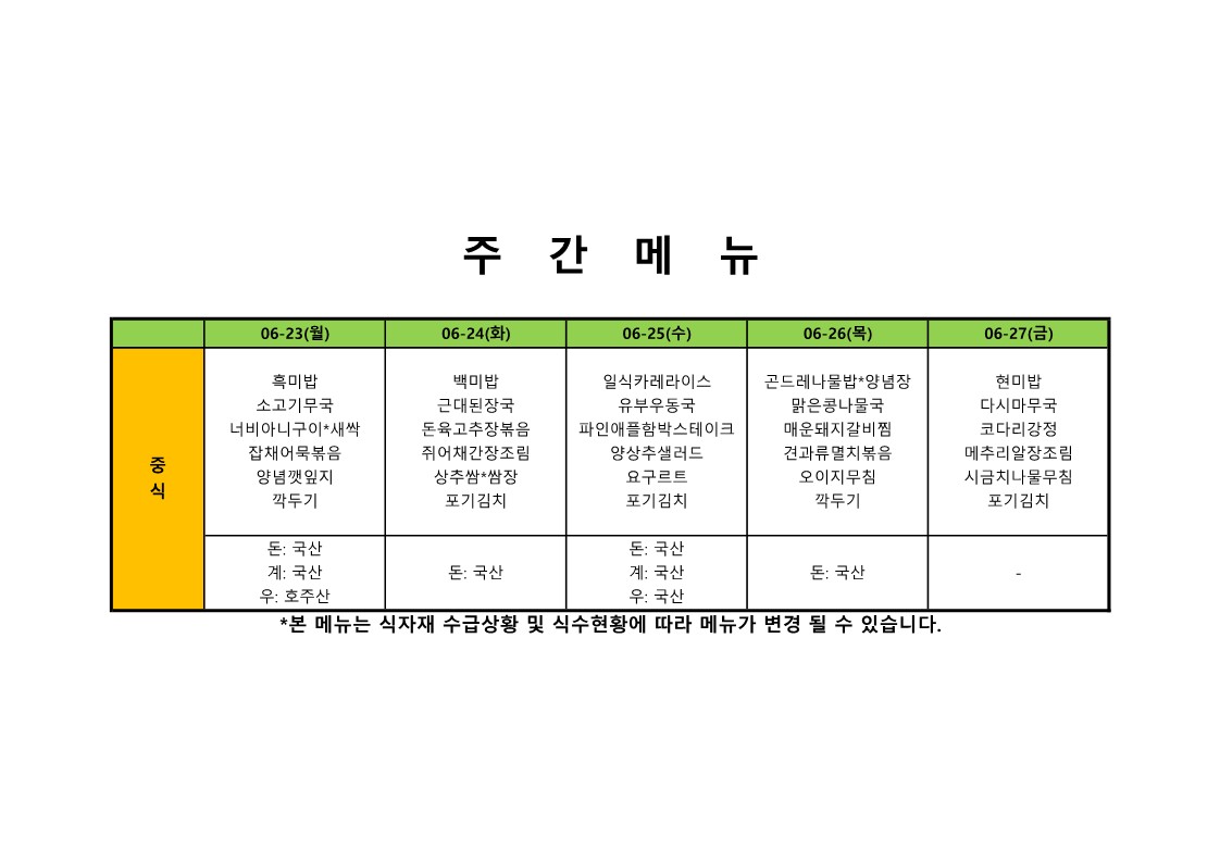 2025. 6. 23. ~ 2025. 6. 27. 주간식단표
