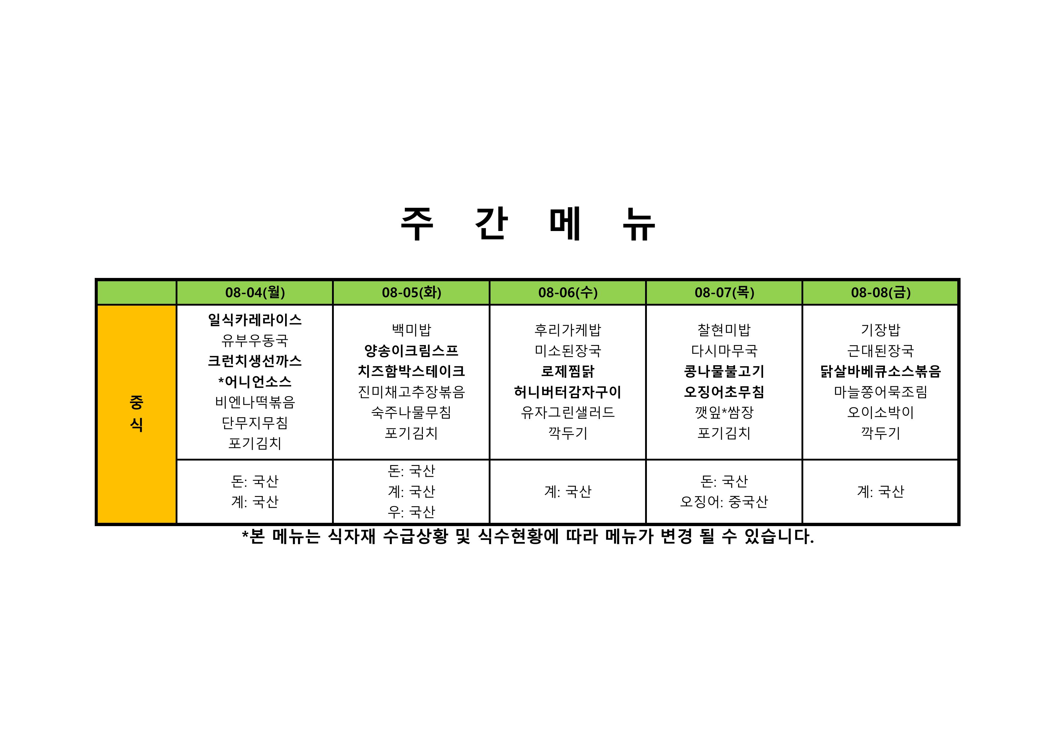 2025. 8. 4. ~ 2025. 8. 8. 주간식단표