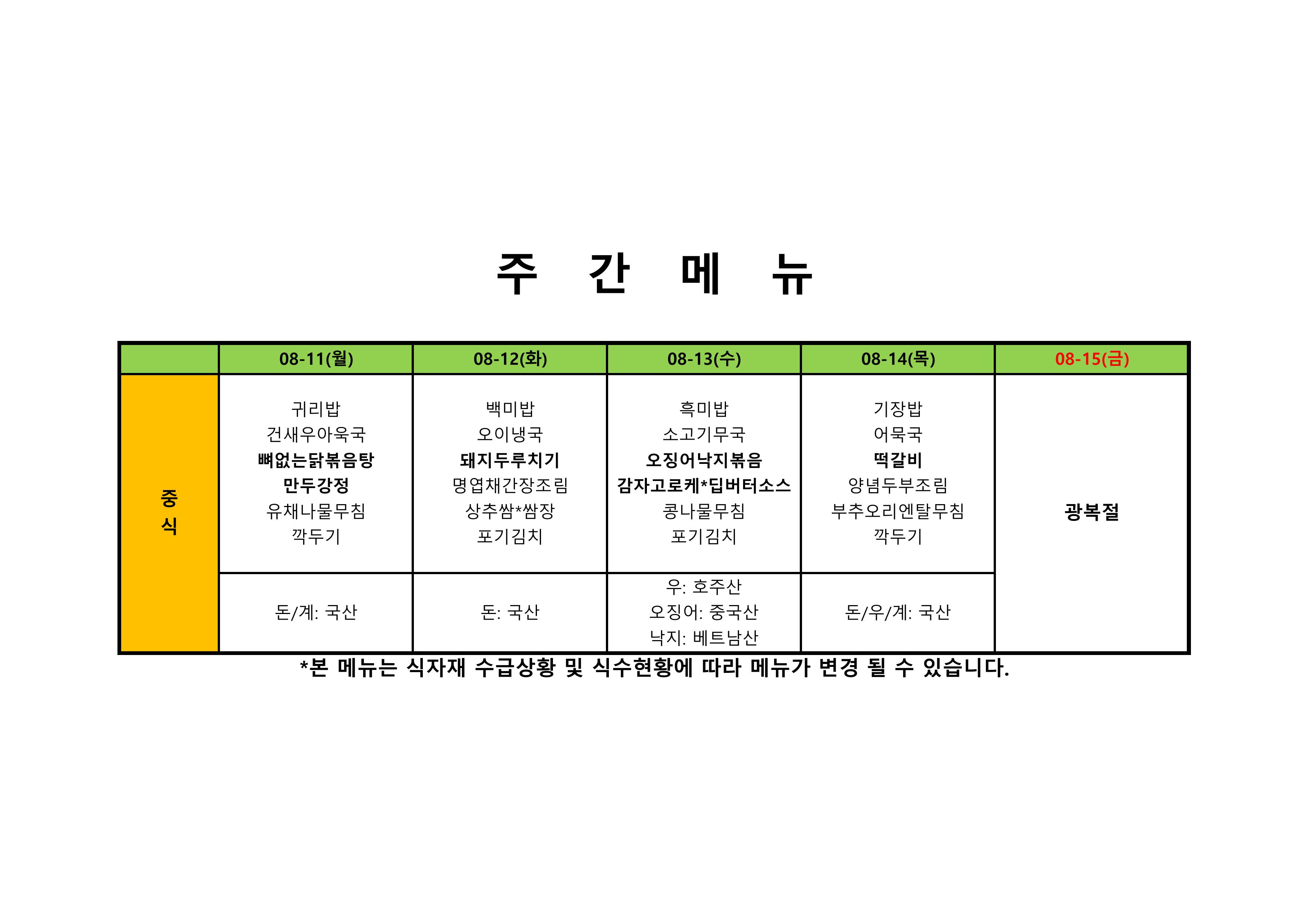 2025. 8. 4. ~ 2025. 8. 8. 주간식단표