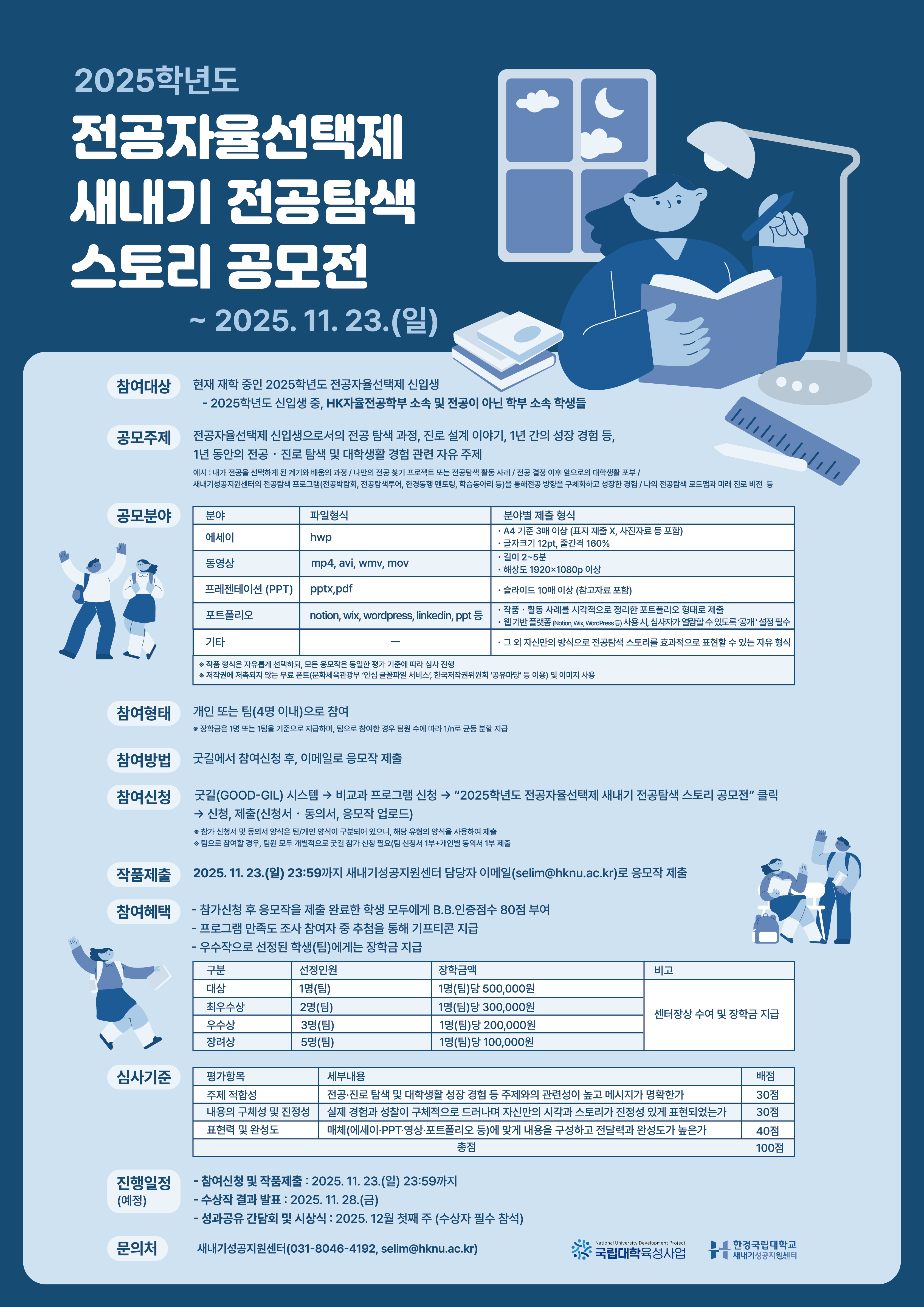 - 작품제출 : 2025. 11. 23.(일) 23:59까지 새내기성공지원센터 담당자 이메일(selim@hknu.ac.kr)로 응모작 제출