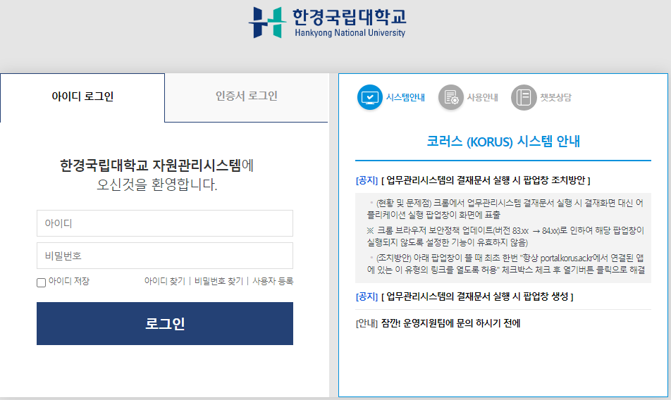 ※ 구 한경대(https://hku.korus.ac.kr), 구 복지대(https://knuw.korus.ac.kr)