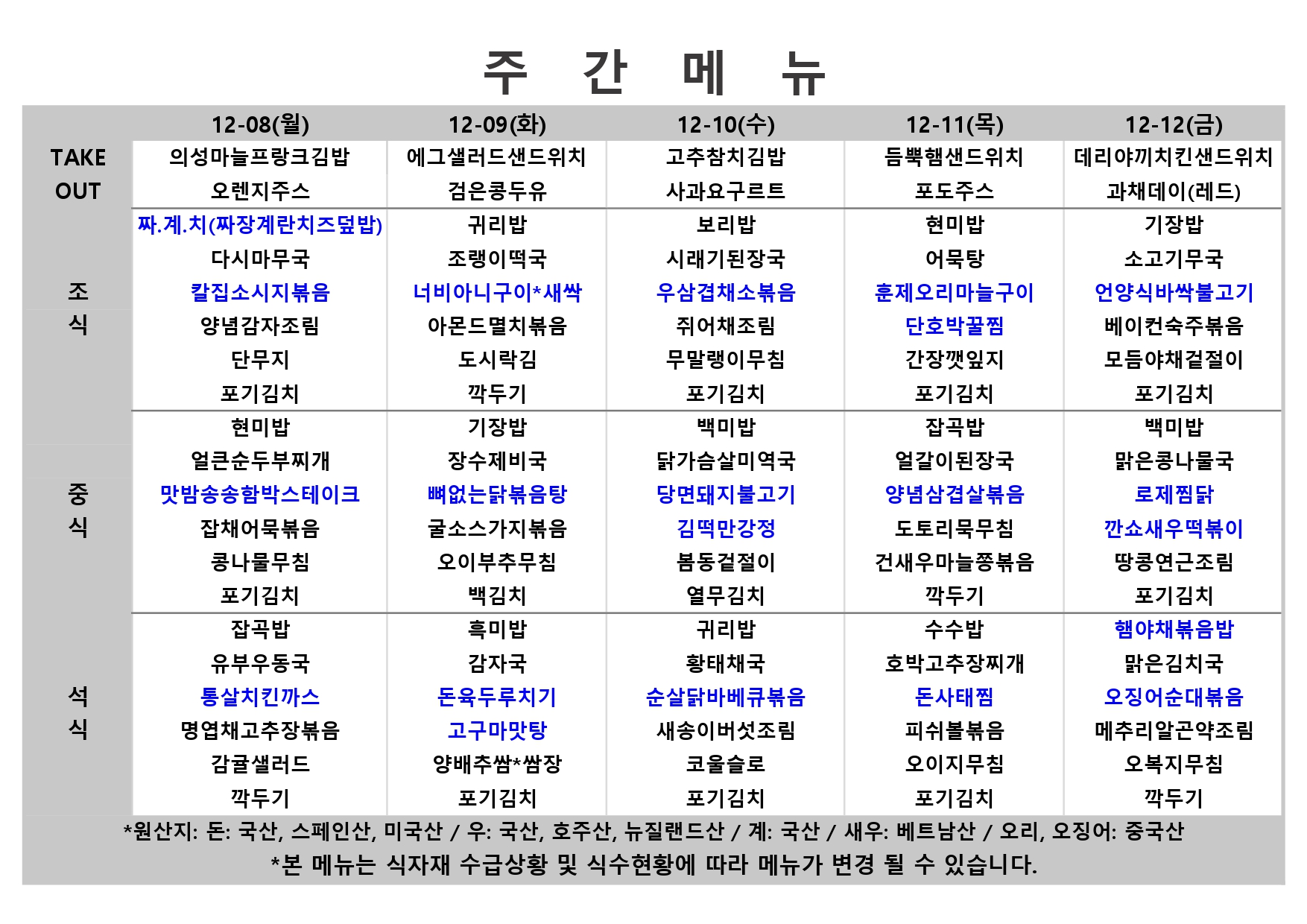 fnctId=bbs,fnctNo=484 단축 url 글번호 90878 2025. 12. 8. ~ 2025. 12. 12. 주간식단표 작성일 2025.12.04 수정일 2025.12.04 작성자 학생생활관(분원) 조회수 28103 다음글 2025. 12. 15. ~ 2025. 12. 19. 주간식단표 윤현지 2025-12-11 16:31:12.0 이전글 2025. 12. 1. ~ 2025. 12. 5. 주간식단표 윤현지 2025-11-27 09:28:39.0 RSS 2.0 총 86 개의 게시물이 있습니다. 게시물 검색 제목 작성자 게시글 리스트 학생생활관 이용 - 주간식단 번호 제목 작성자 작성일 조회수 86 2025. 12. 15. ~ 2025. 12. 19. 주간식단표 새글 학생생활관(분원) 2025.12.11 7852 85 2025. 12. 8. ~ 2025. 12. 12. 주간식단표 학생생활관(분원) 2025.12.04 28103 84 2025. 12. 1. ~ 2025. 12. 5. 주간식단표 학생생활관(분원) 2025.11.27 37821 83 2025. 11. 24. ~ 2025. 11. 28. 주간식단표 학생생활관(분원) 2025.11.20 71602 82 2025. 11. 17. ~ 2025. 11. 21. 주간식단표 학생생활관(분원) 2025.11.13 90682 81 2025. 11. 10. ~ 2025. 11. 14. 주간식단표 학생생활관(분원) 2025.11.06 97975 80 2025. 11. 03. ~ 2025. 11. 07. 주간식단표 학생생활관(분원) 2025.10.30 73778 79 2025. 10. 27. ~ 2025. 10. 31. 주간식단표 학생생활관(분원) 2025.10.23 90491 78 2025. 10. 20. ~ 2025. 10. 24. 주간식단표 학생생활관(분원) 2025.10.17 77716 77 2025. 10. 13. ~ 2025. 10. 17. 주간식단표 학생생활관(분원) 2025.10.02 67837 76 2025. 10. 06. ~ 2025. 10. 10. 주간식단표 학생생활관(분원) 2025.10.02 55542 75 2025. 9. 29. ~ 2025. 10. 3. 주간식단표 학생생활관(분원) 2025.09.25 68111 74 2025. 9. 22. ~ 2025. 9. 26. 주간식단표 학생생활관(분원) 2025.09.19 57132 73 2025. 9. 15. ~ 2025. 9. 19. 주간식단표 학생생활관(분원) 2025.09.11 44169 72 2025. 9. 8. ~ 2025. 9. 12. 주간식단표 학생생활관(분원) 2025.09.06 44345 71 2025. 9. 1. ~ 2025. 9. 5. 주간식단표 학생생활관(분원) 2025.08.27 30041 70 2025. 8. 11. ~ 2025. 8. 14. 주간식단표 학생생활관(분원) 2025.08.07 21221 69 2025. 8. 4. ~ 2025. 8. 8. 주간식단표 학생생활관(분원) 2025.08.01 28377 68 2025. 7. 28. ~ 2025. 8. 1. 주간식단표 학생생활관(분원) 2025.07.25 27997 67 2025. 7. 21. ~ 2025. 7. 25. 주간식단표 학생생활관(분원) 2025.07.17 15515 66 2025. 7. 14. ~ 2025. 7. 18. 주간식단표 학생생활관(분원) 2025.07.11 18614 65 2025. 7. 7. ~ 2025. 7. 11. 주간식단표 학생생활관(분원) 2025.07.04 12965 64 2025. 6. 30. ~ 2025. 7. 4. 주간식단표 학생생활관(분원) 2025.06.27 24513 63 2025. 6. 23. ~ 2025. 6. 27. 주간식단표 학생생활관(분원) 2025.06.20 14119 62 2025. 6. 16. ~ 2025. 6. 20. 주간식단표 학생생활관(분원) 2025.06.13 28689 61 2025. 6. 9. ~ 2025. 6. 13. 주간식단표 학생생활관(분원) 2025.06.05 18998 60 2025. 6. 2. ~ 2025. 6. 6. 주간식단표 학생생활관(분원) 2025.05.30 34635 59 2025. 5. 26. ~ 2025. 5. 30. 주간식단표 학생생활관(분원) 2025.05.23 36376 58 2025. 5. 19. ~ 2025. 5. 23. 주간식단표 학생생활관(분원) 2025.05.16 35647 57 2025. 5. 12. ~ 2025. 5. 16. 주간식단표 학생생활관(분원) 2025.05.09 32001 56 2025. 5. 5. ~ 2025. 5. 9. 주간식단표 학생생활관(분원) 2025.05.02 40280 55 2025. 4. 28. ~ 2025. 5. 2. 주간식단표 학생생활관(분원) 2025.04.25 37169 54 2025. 4. 21. ~ 2025. 4. 25. 주간식단표 학생생활관(분원) 2025.04.18 31334 53 2025. 4. 14. ~ 2025. 4. 18. 주간식단표 학생생활관(분원) 2025.04.15 23811 52 2025. 4. 7. ~ 2025. 4. 11. 주간식단표 학생생활관(분원) 2025.04.07 32064 51 2025. 3 .31. ~ 2025. 4. 4. 주간식단표 학생생활관(분원) 2025.03.31 31560 50 2025. 3. 24. ~ 2025. 3. 28. 주간식단표 학생생활관(분원) 2025.03.24 29273 49 2025. 3. 10. ~ 2025. 3. 14. 주간식단표 학생생활관(분원) 2025.03.10 23604 48 2025. 2. 10.~2025. 2. 14. 주간식단표 학생생활관(분원) 2025.02.10 17290 47 2025. 2 . 3.~2025. 2. 7. 주간식단표 학생생활관(분원) 2025.02.03 20344 46 2025. 1. 20. ~ 2025. 1. 24. 주간식단표 학생생활관(분원) 2025.01.20 17579 45 2025. 1. 13. ~ 2025. 1. 17. 주간식단표 학생생활관(분원) 2025.01.10 26573 44 2025. 1. 6. ~ 2025. 1. 10. 주간식단표 학생생활관(분원) 2025.01.06 30700 43 2024. 12. 30. ~ 2025. 1. 3. 주간식단표 학생생활관(분원) 2024.12.31 30975 42 2024. 12. 16.~2024. 12. 20. 주간식단표 학생생활관(분원) 2024.12.16 29940 41 2024. 12. 2.~ 2024. 12. 6. 주간식단표 학생생활관(분원) 2024.12.02 26668 40 2024. 11. 18.~2024. 11. 22. 주간식단표 학생생활관(분원) 2024.11.18 25592 39 2024. 11. 11.~2024. 11. 15. 주간식단표 학생생활관(분원) 2024.11.11 23799 38 2024. 11. 4.~2024.11. 8. 주간식단표 학생생활관(분원) 2024.11.04 20564 37 2024. 10. 21. ~ 2024. 10. 25. 주간식단표 학생생활관(분원) 2024.10.21 25777 36 2024. 10. 14. ~ 2024. 10. 18. 주간식단표 학생생활관(분원) 2024.10.14 25727 35 2024. 10. 7. ~ 2024. 10. 11. 주간식단표 학생생활관(분원) 2024.10.07 14416 34 2024. 9. 30. ~ 2024. 10. 4. 주간식단표 학생생활관(분원) 2024.09.30 20432 33 2024. 9. 23. ~ 2024. 9. 27. 주간식단표 학생생활관(분원) 2024.09.23 19632 32 2024. 9. 16. ~ 2024. 9. 20. 주간식단표 학생생활관(분원) 2024.09.13 27029 31 2024. 9. 9. ~ 2024. 9. 13. 주간식단표 학생생활관(분원) 2024.09.06 30858 30 2024. 9. 2. ~ 2024. 9. 6. 주간식단표 학생생활관(분원) 2024.09.03 33372 29 2024. 8. 26. ~ 2024. 8. 30. 주간식단표 학생생활관(분원) 2024.08.26 30251 28 2024. 8. 19. ~ 2024. 8. 23. 주간식단표 학생생활관(분원) 2024.08.19 24224 27 2024. 8. 12. ~ 2024. 8. 16. 주간식단표 학생생활관(분원) 2024.08.09 27346 26 2024. 8. 5. ~ 2024. 8. 9. 주간식단표 학생생활관(분원) 2024.08.05 22046 25 2024. 7. 29. ~ 2024. 8. 2. 주간식단표 학생생활관(분원) 2024.07.29 29325 2