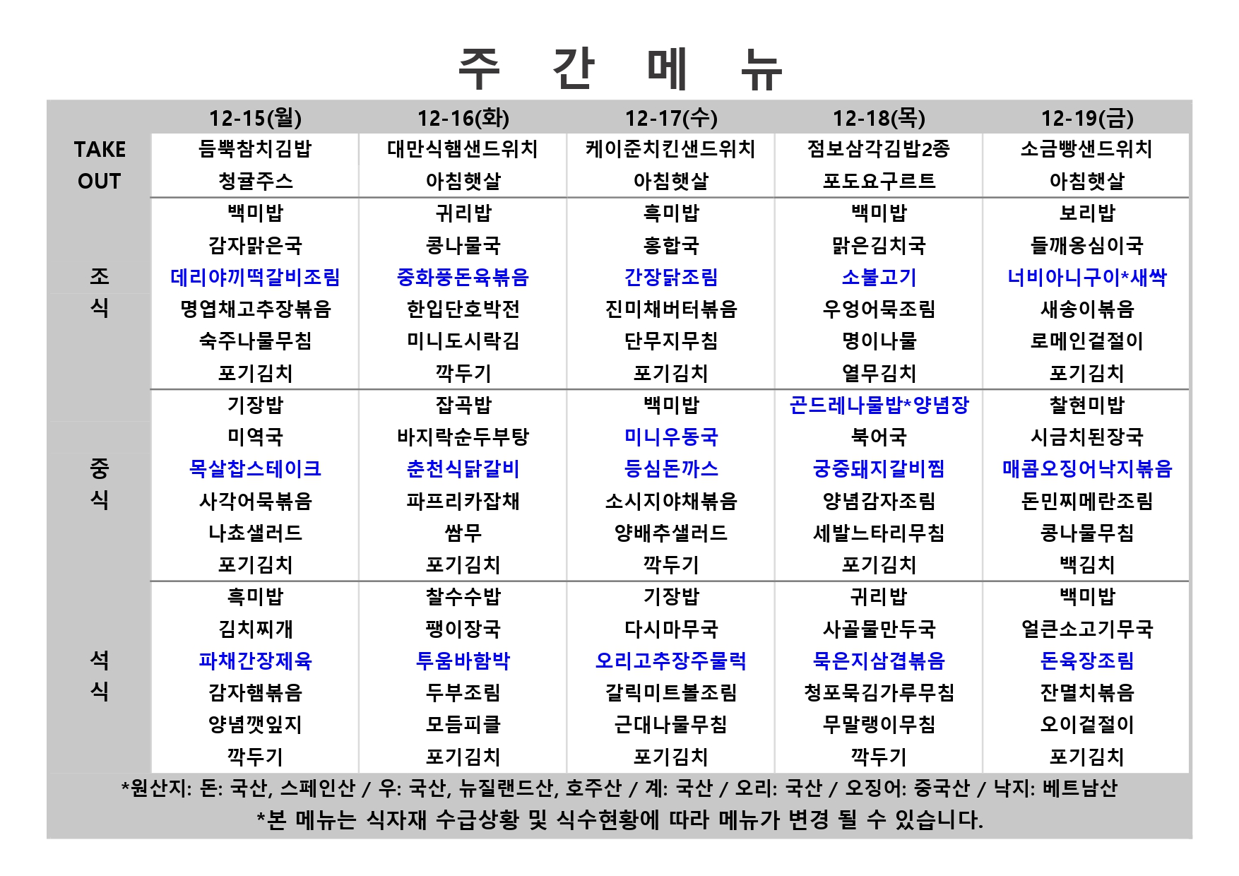 fnctId=bbs,fnctNo=484 단축 url 글번호 91053 2025. 12. 15. ~ 2025. 12. 19. 주간식단표 작성일 2025.12.11 수정일 2025.12.11 작성자 학생생활관(분원) 조회수 7852 다음글 이전글 2025. 12. 8. ~ 2025. 12. 12. 주간식단표 윤현지 2025-12-04 10:58:33.0 RSS 2.0 총 86 개의 게시물이 있습니다. 게시물 검색 제목 작성자 게시글 리스트 학생생활관 이용 - 주간식단 번호 제목 작성자 작성일 조회수 86 2025. 12. 15. ~ 2025. 12. 19. 주간식단표 새글 학생생활관(분원) 2025.12.11 7852 85 2025. 12. 8. ~ 2025. 12. 12. 주간식단표 학생생활관(분원) 2025.12.04 28100 84 2025. 12. 1. ~ 2025. 12. 5. 주간식단표 학생생활관(분원) 2025.11.27 37820 83 2025. 11. 24. ~ 2025. 11. 28. 주간식단표 학생생활관(분원) 2025.11.20 71602 82 2025. 11. 17. ~ 2025. 11. 21. 주간식단표 학생생활관(분원) 2025.11.13 90682 81 2025. 11. 10. ~ 2025. 11. 14. 주간식단표 학생생활관(분원) 2025.11.06 97975 80 2025. 11. 03. ~ 2025. 11. 07. 주간식단표 학생생활관(분원) 2025.10.30 73778 79 2025. 10. 27. ~ 2025. 10. 31. 주간식단표 학생생활관(분원) 2025.10.23 90491 78 2025. 10. 20. ~ 2025. 10. 24. 주간식단표 학생생활관(분원) 2025.10.17 77707 77 2025. 10. 13. ~ 2025. 10. 17. 주간식단표 학생생활관(분원) 2025.10.02 67837 76 2025. 10. 06. ~ 2025. 10. 10. 주간식단표 학생생활관(분원) 2025.10.02 55542 75 2025. 9. 29. ~ 2025. 10. 3. 주간식단표 학생생활관(분원) 2025.09.25 68111 74 2025. 9. 22. ~ 2025. 9. 26. 주간식단표 학생생활관(분원) 2025.09.19 57132 73 2025. 9. 15. ~ 2025. 9. 19. 주간식단표 학생생활관(분원) 2025.09.11 44169 72 2025. 9. 8. ~ 2025. 9. 12. 주간식단표 학생생활관(분원) 2025.09.06 44336 71 2025. 9. 1. ~ 2025. 9. 5. 주간식단표 학생생활관(분원) 2025.08.27 30041 70 2025. 8. 11. ~ 2025. 8. 14. 주간식단표 학생생활관(분원) 2025.08.07 21221 69 2025. 8. 4. ~ 2025. 8. 8. 주간식단표 학생생활관(분원) 2025.08.01 28376 68 2025. 7. 28. ~ 2025. 8. 1. 주간식단표 학생생활관(분원) 2025.07.25 27995 67 2025. 7. 21. ~ 2025. 7. 25. 주간식단표 학생생활관(분원) 2025.07.17 15515 66 2025. 7. 14. ~ 2025. 7. 18. 주간식단표 학생생활관(분원) 2025.07.11 18614 65 2025. 7. 7. ~ 2025. 7. 11. 주간식단표 학생생활관(분원) 2025.07.04 12965 64 2025. 6. 30. ~ 2025. 7. 4. 주간식단표 학생생활관(분원) 2025.06.27 24511 63 2025. 6. 23. ~ 2025. 6. 27. 주간식단표 학생생활관(분원) 2025.06.20 14119 62 2025. 6. 16. ~ 2025. 6. 20. 주간식단표 학생생활관(분원) 2025.06.13 28687 61 2025. 6. 9. ~ 2025. 6. 13. 주간식단표 학생생활관(분원) 2025.06.05 18998 60 2025. 6. 2. ~ 2025. 6. 6. 주간식단표 학생생활관(분원) 2025.05.30 34633 59 2025. 5. 26. ~ 2025. 5. 30. 주간식단표 학생생활관(분원) 2025.05.23 36374 58 2025. 5. 19. ~ 2025. 5. 23. 주간식단표 학생생활관(분원) 2025.05.16 35647 57 2025. 5. 12. ~ 2025. 5. 16. 주간식단표 학생생활관(분원) 2025.05.09 32001 56 2025. 5. 5. ~ 2025. 5. 9. 주간식단표 학생생활관(분원) 2025.05.02 40278 55 2025. 4. 28. ~ 2025. 5. 2. 주간식단표 학생생활관(분원) 2025.04.25 37167 54 2025. 4. 21. ~ 2025. 4. 25. 주간식단표 학생생활관(분원) 2025.04.18 31334 53 2025. 4. 14. ~ 2025. 4. 18. 주간식단표 학생생활관(분원) 2025.04.15 23811 52 2025. 4. 7. ~ 2025. 4. 11. 주간식단표 학생생활관(분원) 2025.04.07 32063 51 2025. 3 .31. ~ 2025. 4. 4. 주간식단표 학생생활관(분원) 2025.03.31 31560 50 2025. 3. 24. ~ 2025. 3. 28. 주간식단표 학생생활관(분원) 2025.03.24 29273 49 2025. 3. 10. ~ 2025. 3. 14. 주간식단표 학생생활관(분원) 2025.03.10 23604 48 2025. 2. 10.~2025. 2. 14. 주간식단표 학생생활관(분원) 2025.02.10 17290 47 2025. 2 . 3.~2025. 2. 7. 주간식단표 학생생활관(분원) 2025.02.03 20344 46 2025. 1. 20. ~ 2025. 1. 24. 주간식단표 학생생활관(분원) 2025.01.20 17579 45 2025. 1. 13. ~ 2025. 1. 17. 주간식단표 학생생활관(분원) 2025.01.10 26573 44 2025. 1. 6. ~ 2025. 1. 10. 주간식단표 학생생활관(분원) 2025.01.06 30700 43 2024. 12. 30. ~ 2025. 1. 3. 주간식단표 학생생활관(분원) 2024.12.31 30974 42 2024. 12. 16.~2024. 12. 20. 주간식단표 학생생활관(분원) 2024.12.16 29939 41 2024. 12. 2.~ 2024. 12. 6. 주간식단표 학생생활관(분원) 2024.12.02 26668 40 2024. 11. 18.~2024. 11. 22. 주간식단표 학생생활관(분원) 2024.11.18 25592 39 2024. 11. 11.~2024. 11. 15. 주간식단표 학생생활관(분원) 2024.11.11 23798 38 2024. 11. 4.~2024.11. 8. 주간식단표 학생생활관(분원) 2024.11.04 20564 37 2024. 10. 21. ~ 2024. 10. 25. 주간식단표 학생생활관(분원) 2024.10.21 25776 36 2024. 10. 14. ~ 2024. 10. 18. 주간식단표 학생생활관(분원) 2024.10.14 25727 35 2024. 10. 7. ~ 2024. 10. 11. 주간식단표 학생생활관(분원) 2024.10.07 14416 34 2024. 9. 30. ~ 2024. 10. 4. 주간식단표 학생생활관(분원) 2024.09.30 20431 33 2024. 9. 23. ~ 2024. 9. 27. 주간식단표 학생생활관(분원) 2024.09.23 19631 32 2024. 9. 16. ~ 2024. 9. 20. 주간식단표 학생생활관(분원) 2024.09.13 27029 31 2024. 9. 9. ~ 2024. 9. 13. 주간식단표 학생생활관(분원) 2024.09.06 30858 30 2024. 9. 2. ~ 2024. 9. 6. 주간식단표 학생생활관(분원) 2024.09.03 33363 29 2024. 8. 26. ~ 2024. 8. 30. 주간식단표 학생생활관(분원) 2024.08.26 30251 28 2024. 8. 19. ~ 2024. 8. 23. 주간식단표 학생생활관(분원) 2024.08.19 24218 27 2024. 8. 12. ~ 2024. 8. 16. 주간식단표 학생생활관(분원) 2024.08.09 27346 26 2024. 8. 5. ~ 2024. 8. 9. 주간식단표 학생생활관(분원) 2024.08.05 22046 25 2024. 7. 29. ~ 2024. 8. 2. 주간식단표 학생생활관(분원) 2024.07.29 29325 24 2024. 7. 22. ~ 2024. 7. 26. 주간식단표 학생생활관(분원) 2024.07